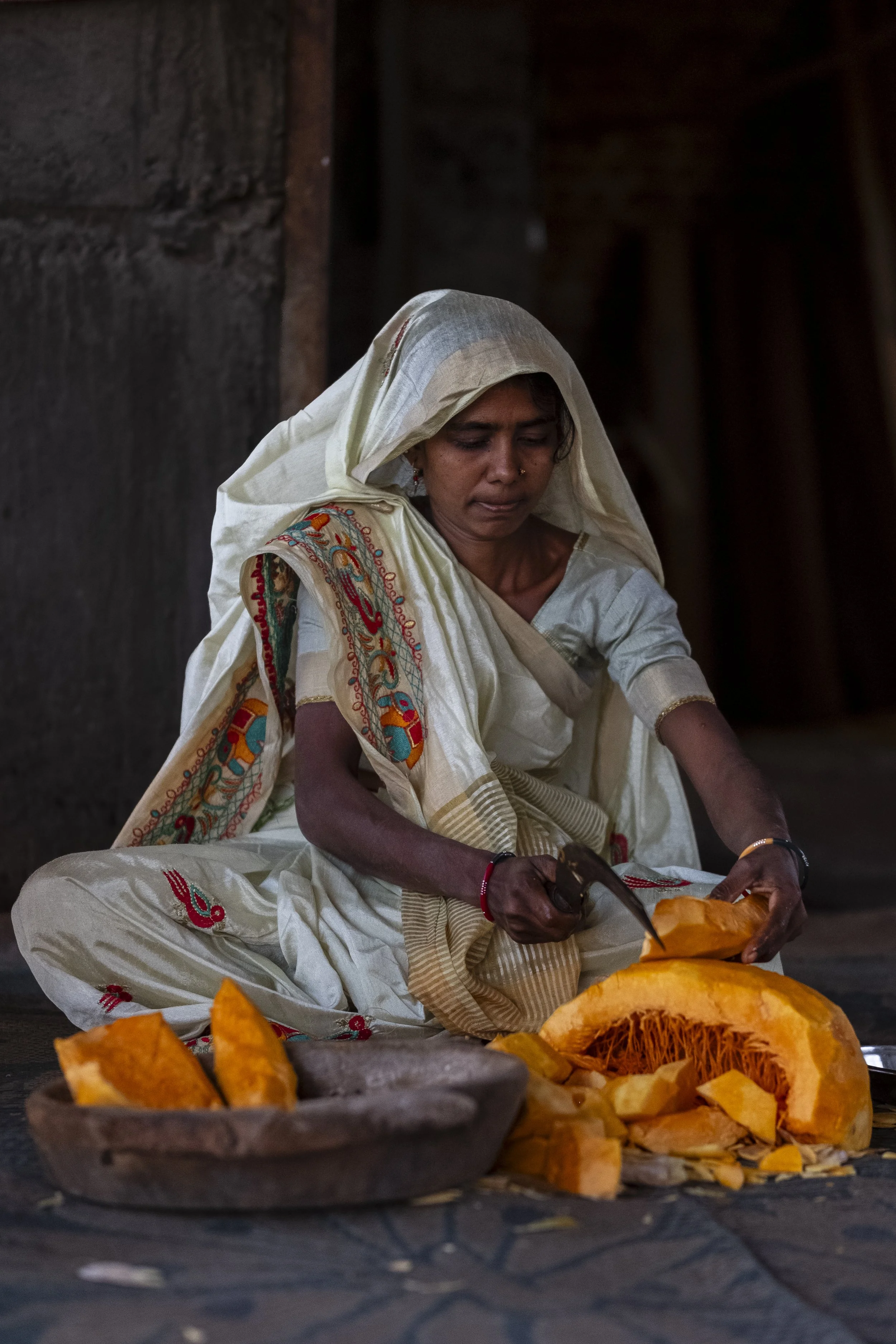 The moment you enter the open kitchen, you’re hit by the soft woody scent of smoke rising from the chulha. A quiet fire crackles under a clay pot . The milk — full-fat, slightly yellowish — simmers gently, a thin film forming on top. The women slice the pumpkin, revealing its bright golden-orange flesh. The men help peel and cube the thick outer shell, breaking it down into soft chunks small enough to melt into the dish. The rice used is small grained desi rice and is slightly starchy, which adds body to the pudding. The boiled and mashed pumpkin go in first, then a handful of rice. Everything is cooked together in that single vessel. No stirring yet. Just watching. The milk reduces slowly, thickens gently. After a while, grated jaggery is added — not beforehand, never before, or the milk will split, we are told. The jaggery foams slightly, melts into the pudding and brings everything together with its warm sweetness. The pot is taken off the fire and allowed to sit. The final touch is a pinch of salt. Yes, salt. “To wake up the sweetness,” she says.